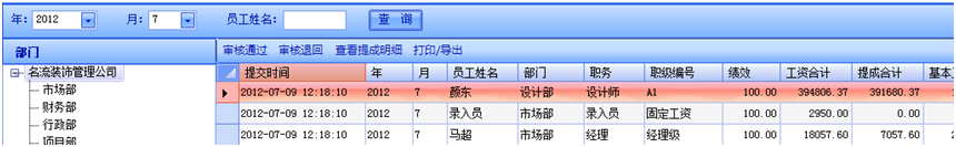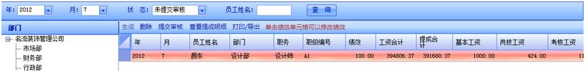 生成工資前要為員工選擇職級(jí),否則無法為該員工生成工資,員工工資可按月批量生成。員工工資生成后將狀態(tài)選擇為未提交審核,便可查看該員工的工資情況,此時(shí)可以修改員工的績(jī)效,績(jī)效修改后,績(jī)效工資和工資合計(jì)會(huì)發(fā)生相應(yīng)的變化。若確定無誤后就可以提交審核,提交審核也可以批量操作。