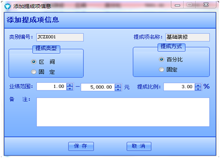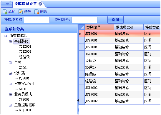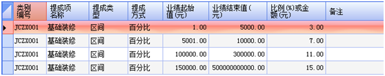 如圖,該圖是基礎(chǔ)裝修下的提成編號(hào)為JCZX001的提成信息。