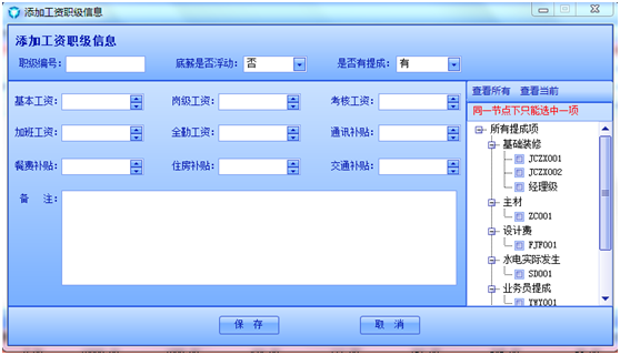 添加和修改工資職級(jí)時(shí),建議先輸入職級(jí)編號(hào),選擇底薪是否浮動(dòng),是否有提成,因?yàn)檫x擇不同的選項(xiàng),界面會(huì)發(fā)生相應(yīng)的變化。如圖是添加職級(jí)的界面。
