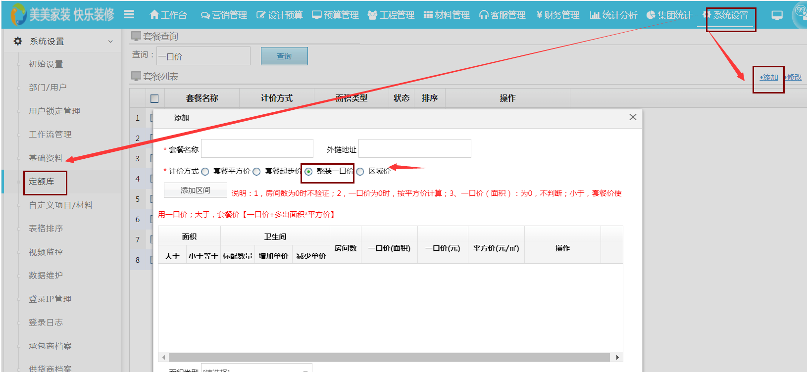 步驟一:首先通過系統(tǒng)設置---定額庫--套餐定額,添加套餐預算的報價方式,填入相應的數(shù)據(jù)完成保存