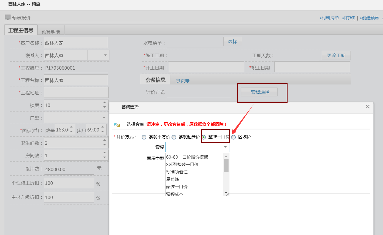 美佳ERP采用智能報價系統(tǒng),一鍵就可生成預算報價,明細目錄一目了然。數(shù)據(jù)精確到分,同時效果圖可隨時調(diào)出,滿足業(yè)主的一切需求。以下針對預算報價中套餐預算一口價的報價方式,美佳云裝做了如下優(yōu)化,與裝修公司的報價更貼合實際情況一鍵生成。