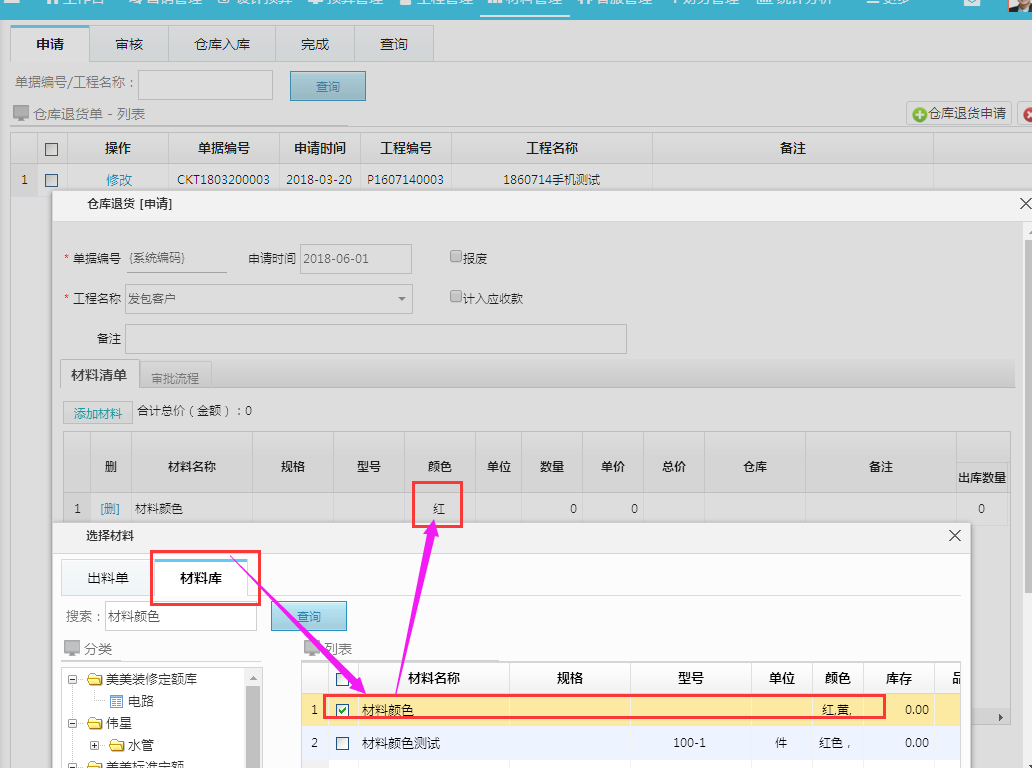 1:選中出庫單中材料:默認(rèn)材料顏色為制作領(lǐng)料/出庫單申請(qǐng)時(shí)選中的材料顏色;