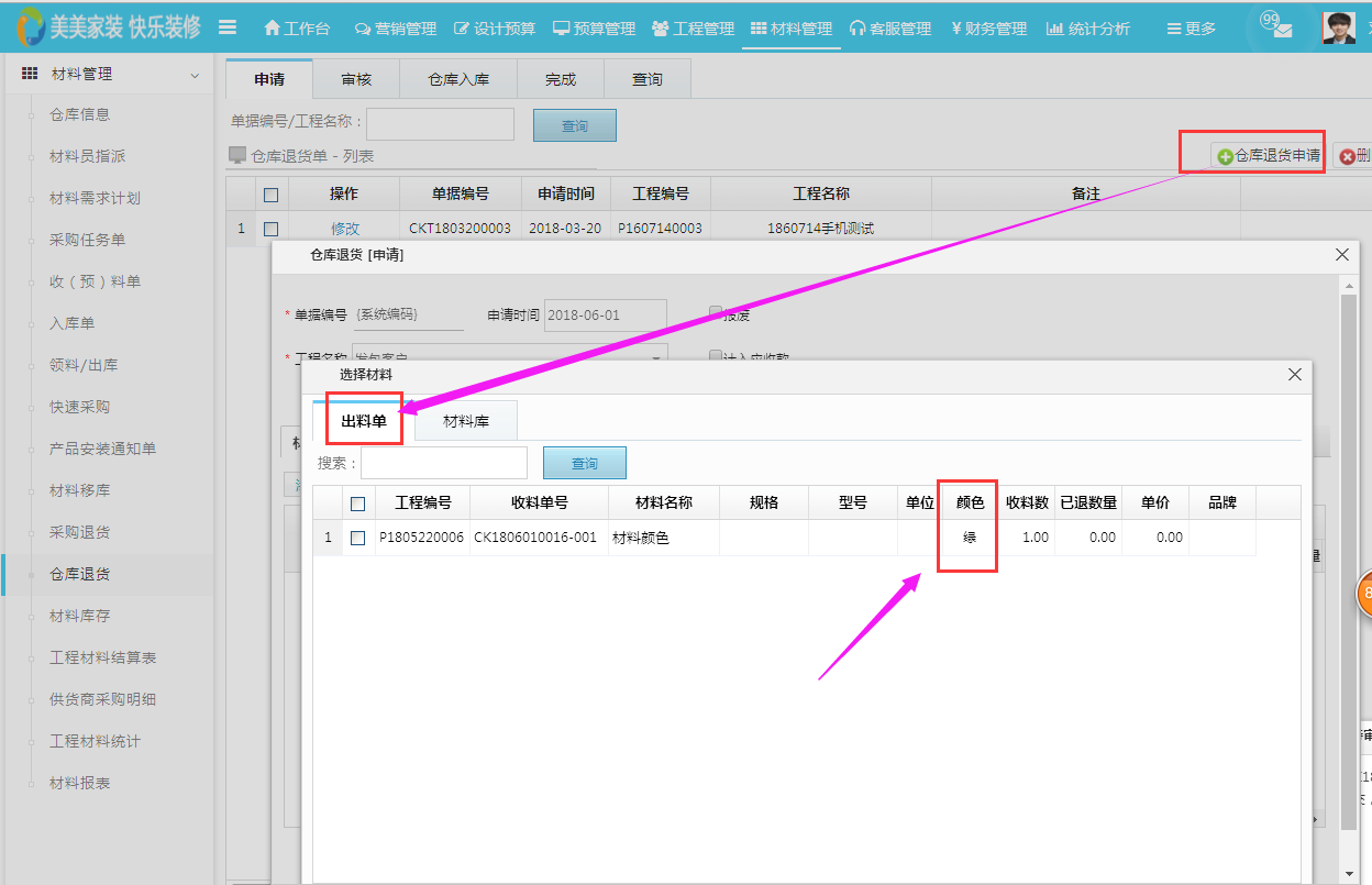 倉庫退貨單選選材料顯示顏色區(qū)別如下: