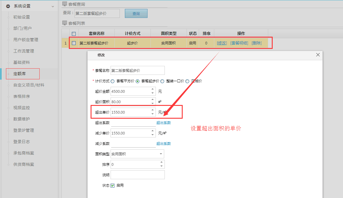 注(完成上述的設置后,將系統退出重新登錄。然后進入:定額庫——》套餐定額 ——》設置 )