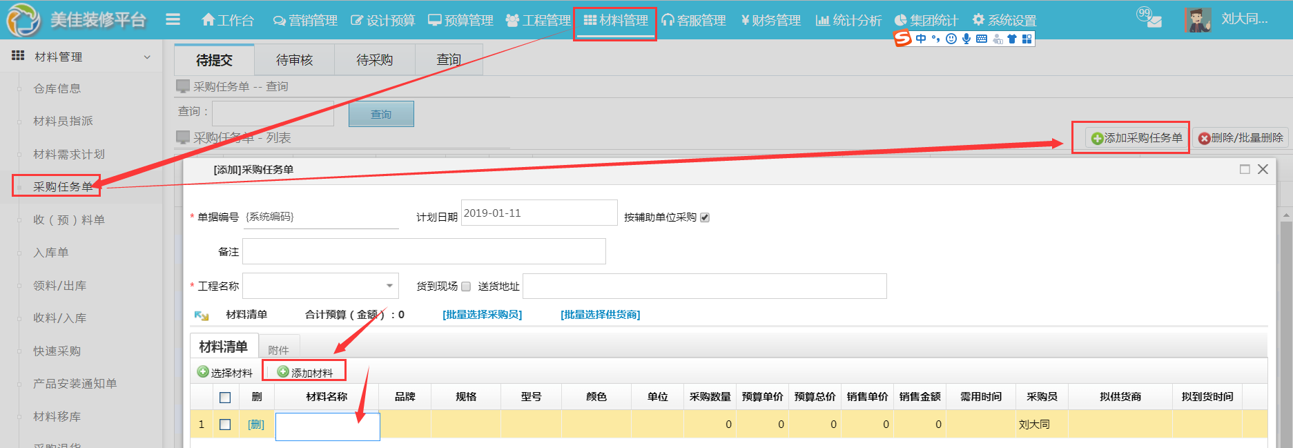 第二步驟:通過(guò)【材料管理】--【采購(gòu)任務(wù)單】--【添加材料】完成自定義材料的添加