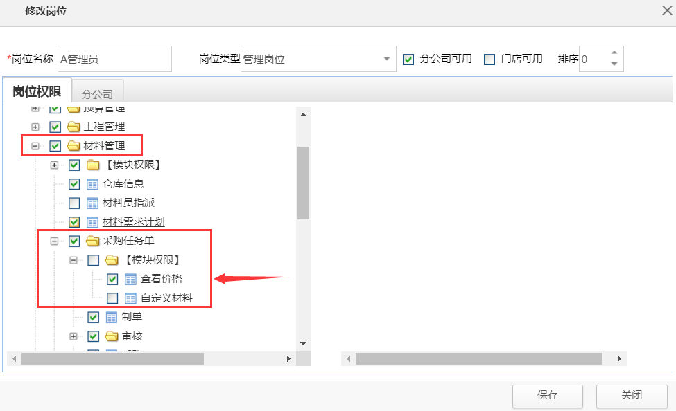 第一步驟:通過(guò)崗位權(quán)限將采購(gòu)任務(wù)單可自定義添加材料的功能開(kāi)通