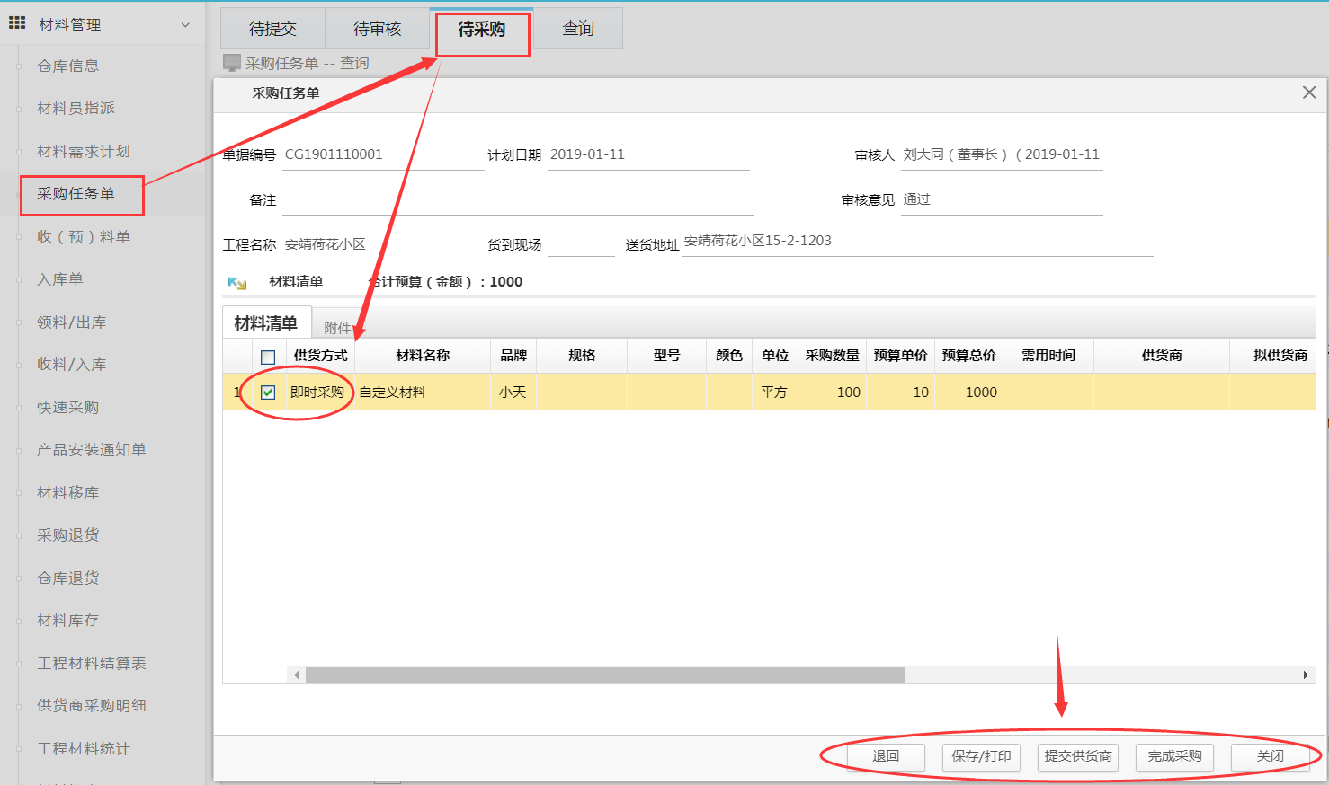 注意:采購(gòu)任務(wù)單自定義添加的材料只能貨到現(xiàn)場(chǎng),無(wú)法直接入倉(cāng)庫(kù),因?yàn)槎~庫(kù)未維護(hù)進(jìn)去庫(kù)存系統(tǒng)無(wú)法識(shí)別
