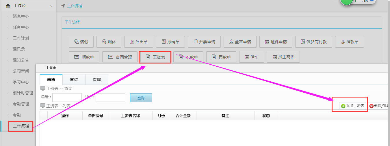 第三步具體操作請依次點(diǎn)擊工作臺(tái)---工資表--申請