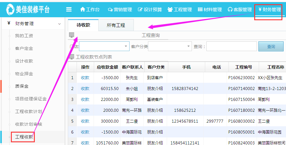 啟用收款計劃審核后只有審核通過的客戶才能在工程收款中顯示進行收款,顯示如下: