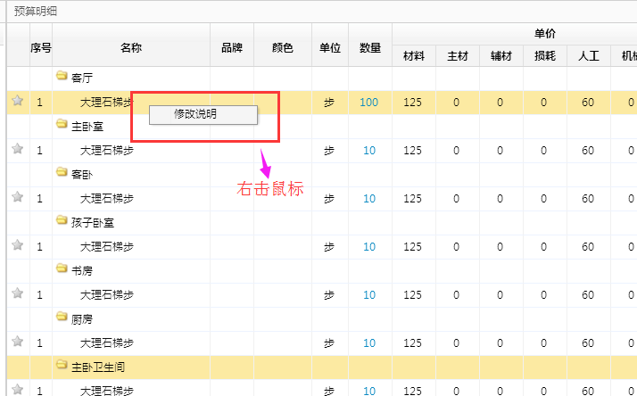 2、進入【設計預算】---選擇一個做好的工程預算鼠標右擊一個項目即可進行說明修改。