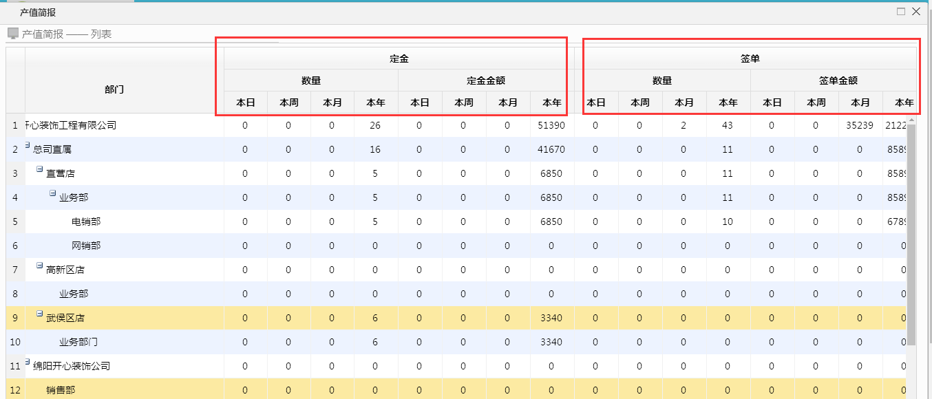 2:在此簡報中可直觀的查詢各部門業務員在各個時間段簽約客戶的定金和簽單匯總數量和總金額