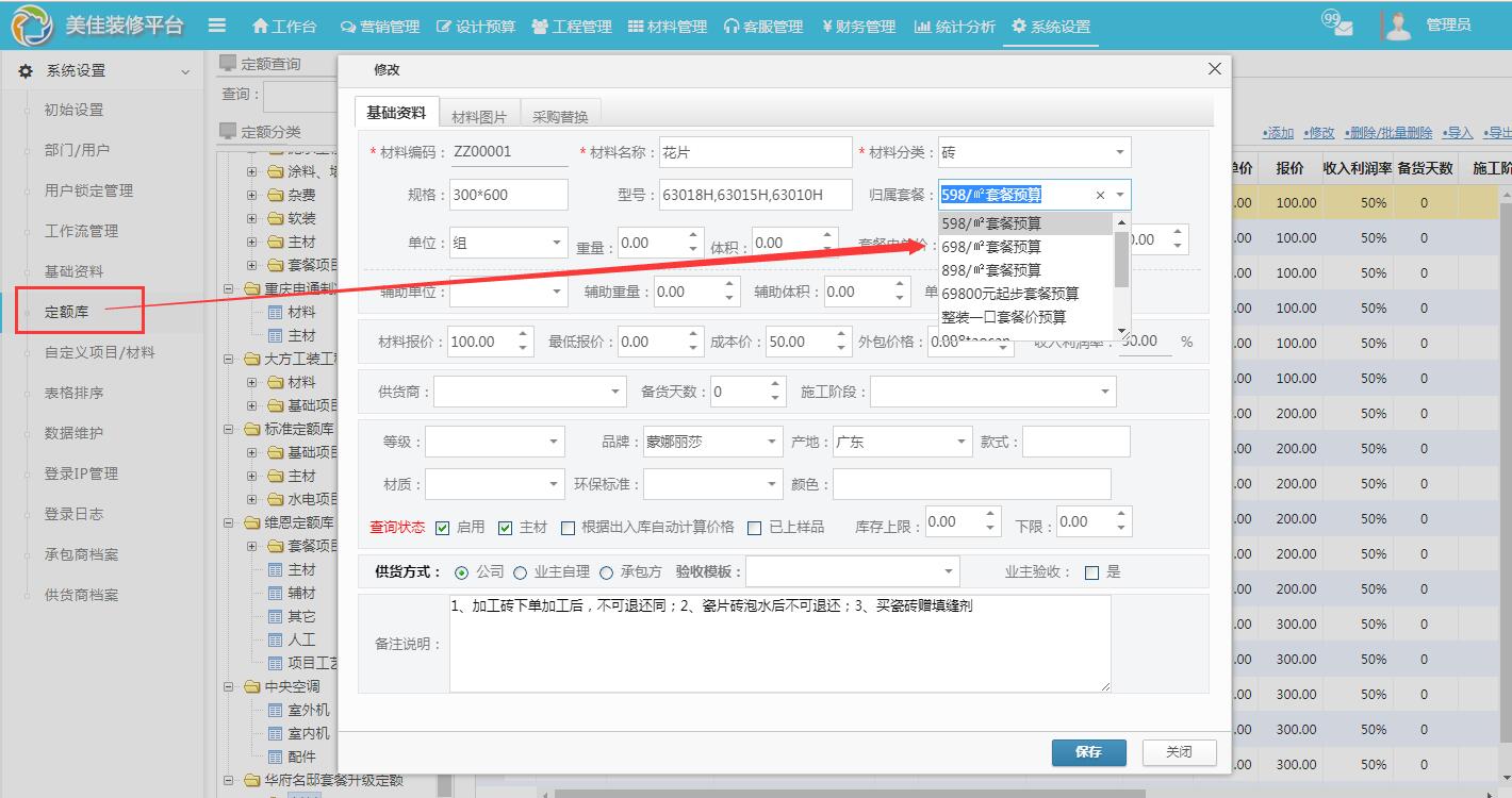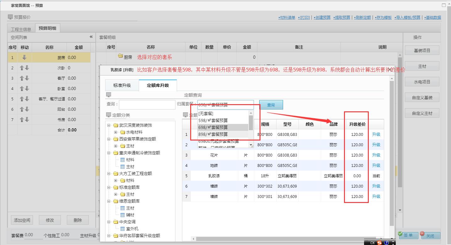 補充:客戶預算選擇的套系是598元/平,其中某材料要升級,不管是從598元/升級為698元/平,還是升級為598元/平,系統都會自動計算差價。