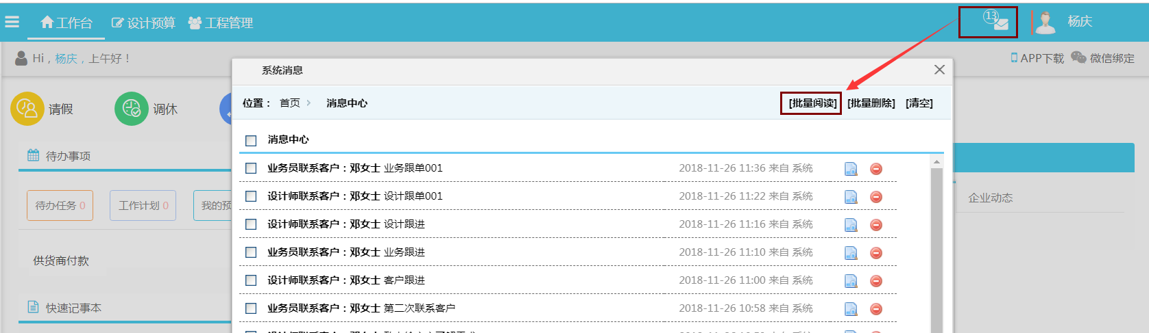 2、消息中心可查看有史以來所有的工作提醒消息,所有內容一目了然,快速查漏自己未完成的工作。同時新增批量閱讀的功能,已閱讀的信息便可進行勾選,使之從未閱讀數量中自動過濾