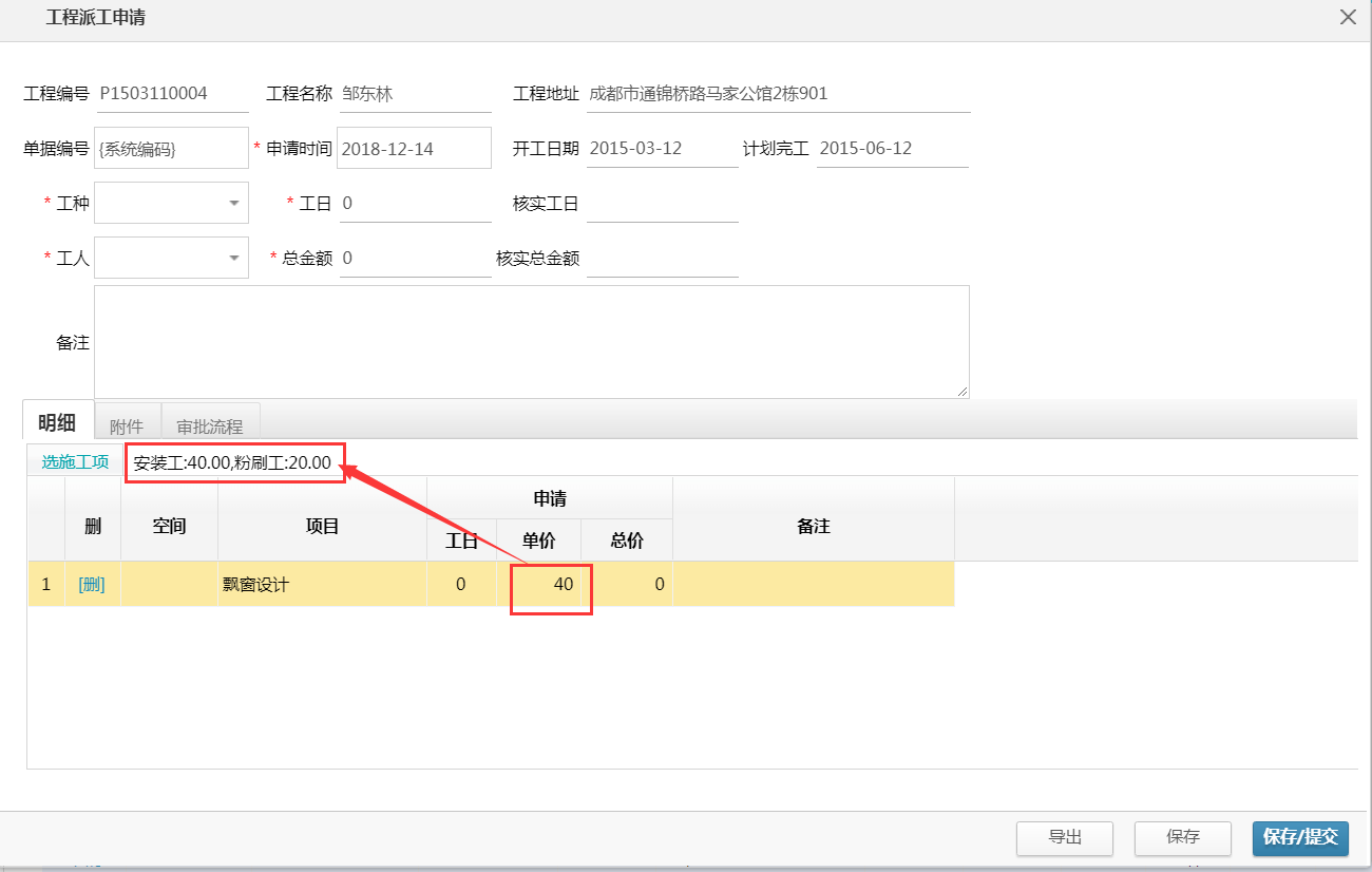 如果工程派工時直接選擇施工項,則以施工項中已設置的工種報價為準,如果此項目中包含多個工種,則以第一個工種報價為準。如下所示