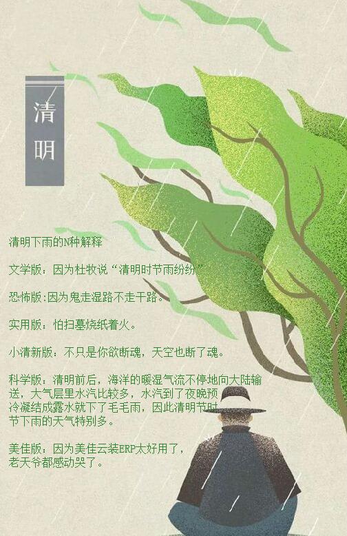 科學版:清明前后,海洋的暖濕氣流不停地向大陸輸送,大氣層里水汽比較多,水汽到了夜晚預冷凝結成露水就下了毛毛雨, 因此清明節時節下雨的天氣特別多。