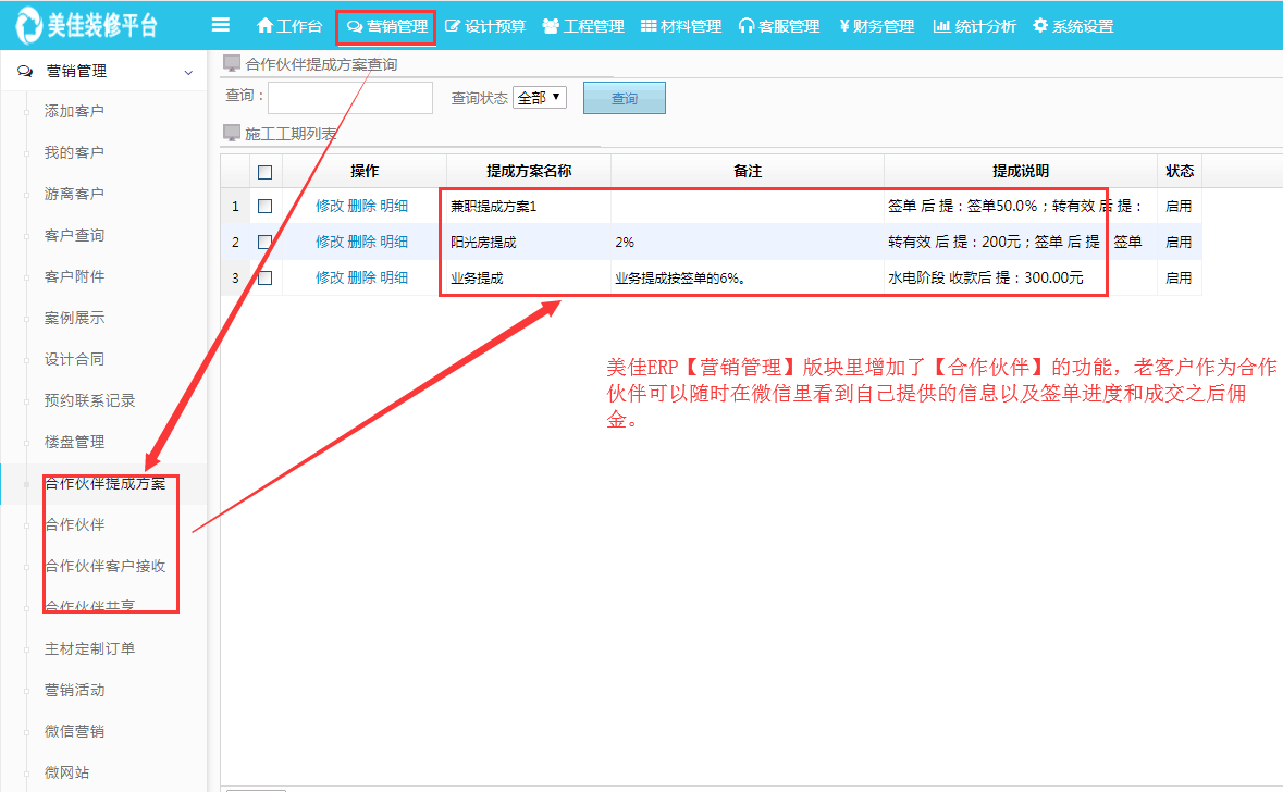 客戶帶客戶是既省時間簽單成功率又高的銷售途徑。想要回單就要把老客戶轉化為我們的合作伙伴。美佳云裝通過掃描二維碼對接微信是透明便捷的合作平臺,大大的促進客戶作為合作伙伴來向我們提供信息,與老客戶保持了粘度;也很大程度上杜絕合作伙伴的后顧之憂,比如把信息介紹給我們有沒有簽單成交,簽單金額是多少,自己能拿到多少傭金等等。