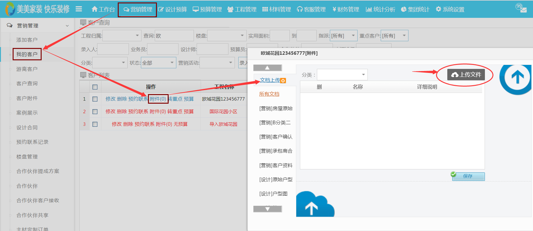 在營銷管理、設計預算中設計師和業務員均可將客戶的合同、設計圖等相關文件上傳至具體客戶文檔中且可批量上傳。批量上傳文件大大的節省了之前單個上傳